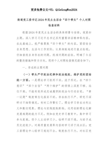 【七哥公文】2025年:街道党工委书记2024年民主生活会“四个带头”个人对照检查材料+更多免费公文+VX:QiGeGongWen2024+更多免费公文+VX:QiGeGongWen2024