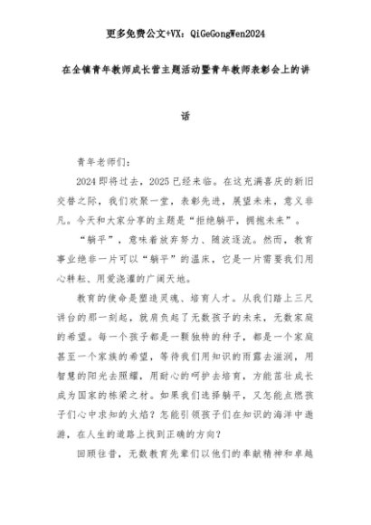 【七哥公文】2025年:在全镇青年教师成长营主题活动暨青年教师表彰会上的讲话+更多免费公文+VX:QiGeGongWen2024+更多免费公文+VX:QiGeGongWen2024