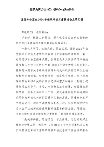 【七哥公文】2025年:党委办公室在2024年绩效考核工作推进会上的汇报+更多免费公文+VX:QiGeGongWen2024+更多免费公文+VX:QiGeGongWen2024