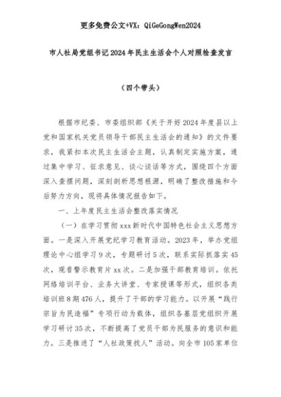 【七哥公文】2025年:市人社局党组书记2024年民主生活会个人对照检查发言(四个带头)+更多免费公文+VX:QiGeGongWen2024+更多免费公文+VX:QiGeGongWen2024