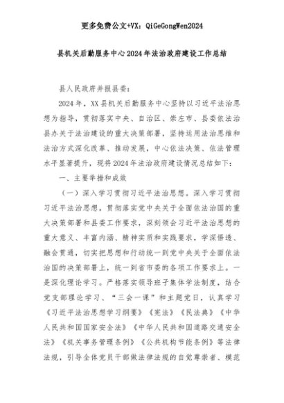 【七哥公文】2025年:县机关后勤服务中心2024年法治政府建设工作总结+更多免费公文+VX:QiGeGongWen2024+更多免费公文+VX:QiGeGongWen2024