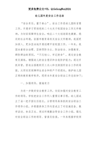 【七哥公文】2025年:_幼儿园年度安全工作总结_+更多免费公文+VX:QiGeGongWen2024+更多免费公文+VX:QiGeGongWen2024