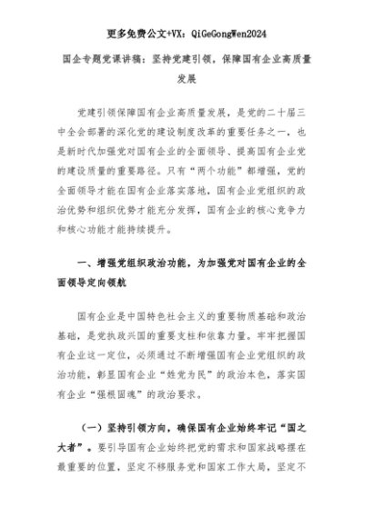 【七哥公文】2025年:国企专题党课讲稿:坚持党建引领,保障国有企业高质量发展+更多免费公文+VX:QiGeGongWen2024+更多免费公文+VX:QiGeGongWen2024