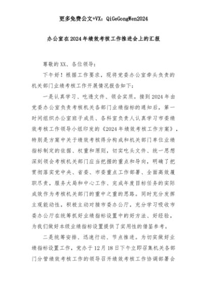 【七哥公文】2025年:办公室在2024年绩效考核工作推进会上的汇报+更多免费公文+VX:QiGeGongWen2024+更多免费公文+VX:QiGeGongWen2024