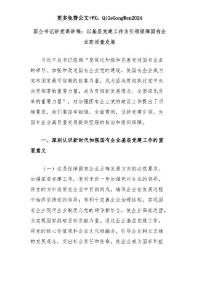 【七哥公文】2025年:国企书记讲党课讲稿:以基层党建工作为引领保障国有企业高质量发展+更多免费公文+VX:QiGeGongWen2024+更多免费公文+VX:QiGeGongWen2024