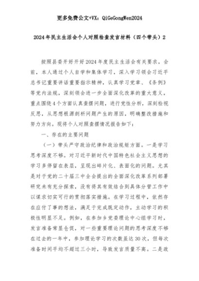 【七哥公文】2025年:2024年民主生活会个人对照检查发言材料(四个带头)2+更多免费公文+VX:QiGeGongWen2024+更多免费公文+VX:QiGeGongWen2024