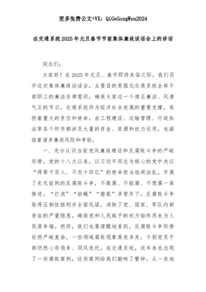 【七哥公文】2025年:在交通系统2025年元旦春节节前集体廉政谈话会上的讲话+更多免费公文+VX:QiGeGongWen2024+更多免费公文+VX:QiGeGongWen2024