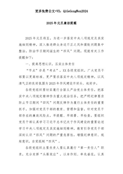 【七哥公文】2025年:2025年元旦廉洁提醒+更多免费公文+VX:QiGeGongWen2024+更多免费公文+VX:QiGeGongWen2024