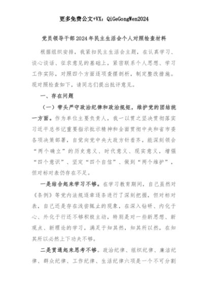 【七哥公文】2025年:党员领导干部2024年民主生活会个人对照检查材料+更多免费公文+VX:QiGeGongWen2024+更多免费公文+VX:QiGeGongWen2024