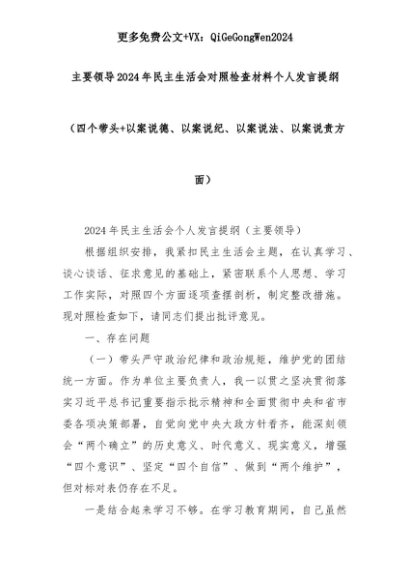 【七哥公文】2025年:主要领导2024年民主生活会对照检查材料个人发言提纲(四个带头+以案说德、以案说纪、以案说法、以案说责方面)+更多免费公文+VX:QiGeGongWen2024+更多免费公文+VX:QiGeGongWen2024