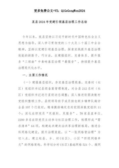 【七哥公文】2025年:某县2024年党建引领基层治理工作总结+更多免费公文+VX:QiGeGongWen2024+更多免费公文+VX:QiGeGongWen2024