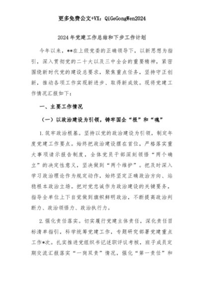 【七哥公文】2025年:2024年党建工作总结和下步工作计划+更多免费公文+VX:QiGeGongWen2024+更多免费公文+VX:QiGeGongWen2024