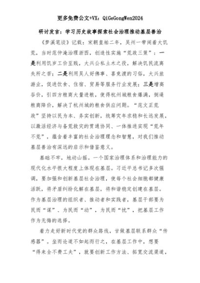 【七哥公文】2025年:研讨发言:学习历史故事探索社会治理推动基层善治+更多免费公文+VX:QiGeGongWen2024+更多免费公文+VX:QiGeGongWen2024