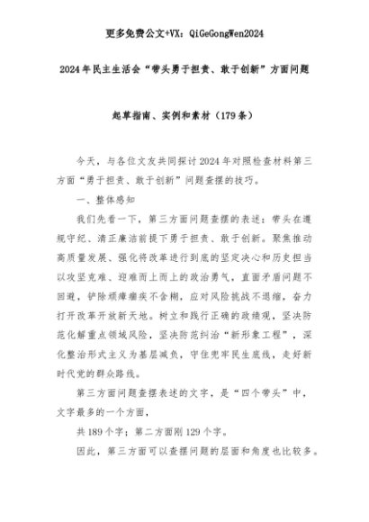 【七哥公文】2025年:(179条)2024年民主生活会“带头勇于担责、敢于创新”方面问题起草指南、实例和素材+更多免费公文+VX:QiGeGongWen2024+更多免费公文+VX:QiGeGongWen2024
