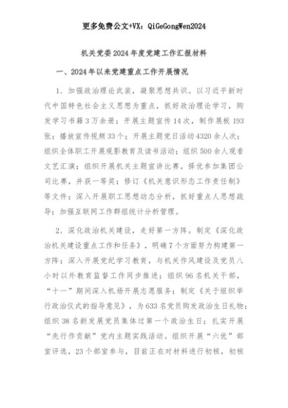 【七哥公文】2025年:机关党委2024年度党建工作汇报材料+更多免费公文+VX:QiGeGongWen2024+更多免费公文+VX:QiGeGongWen2024