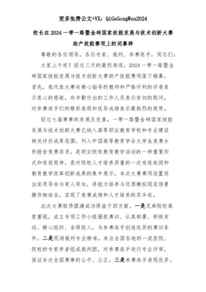 【七哥公文】2025年:校长在2024一带一路暨金砖国家技能发展与技术创新大赛助产技能赛项上的闭幕辞+更多免费公文+VX:QiGeGongWen2024+更多免费公文+VX:QiGeGongWen2024