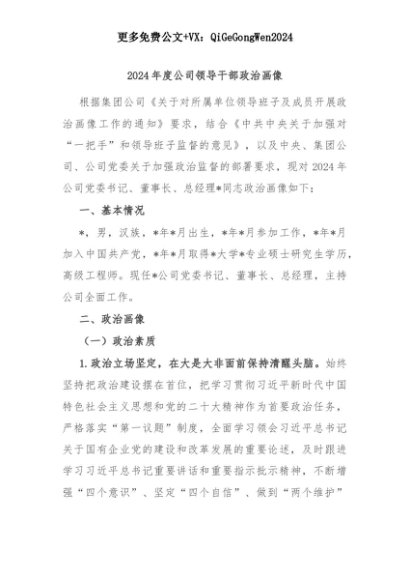 【七哥公文】2025年:2024年度公司领导干部政治画像+更多免费公文+VX:QiGeGongWen2024+更多免费公文+VX:QiGeGongWen2024