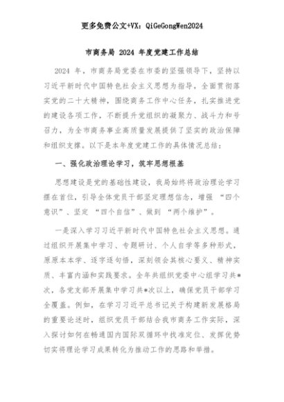 【七哥公文】2025年:市商务局 2024 年度党建工作总结+更多免费公文+VX:QiGeGongWen2024+更多免费公文+VX:QiGeGongWen2024