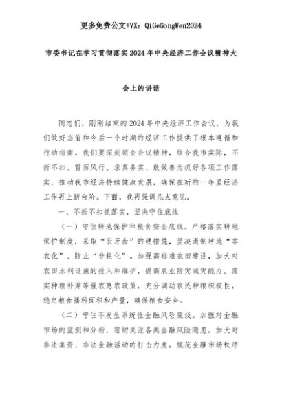 【七哥公文】2025年:市委书记在学习贯彻落实2024年中央经济工作会议精神大会上的讲话+更多免费公文+VX:QiGeGongWen2024+更多免费公文+VX:QiGeGongWen2024
