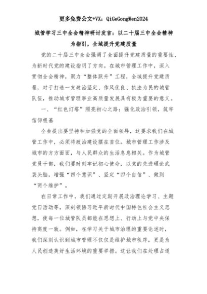 【七哥公文】2025年:城管学习三中全会精神研讨发言:以二十届三中全会精神为指引,全域提升党建质量+更多免费公文+VX:QiGeGongWen2024+更多免费公文+VX:QiGeGongWen2024