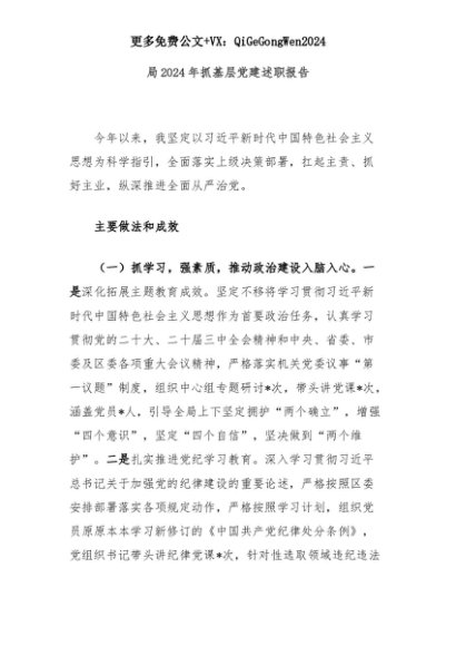 【七哥公文】2025年:局2024年抓基层党建述职报告+更多免费公文+VX:QiGeGongWen2024+更多免费公文+VX:QiGeGongWen2024