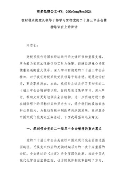 【七哥公文】2025年:在财税系统党员领导干部学习贯彻党的二十届三中全会精神培训班上的讲话+更多免费公文+VX:QiGeGongWen2024+更多免费公文+VX:QiGeGongWen2024