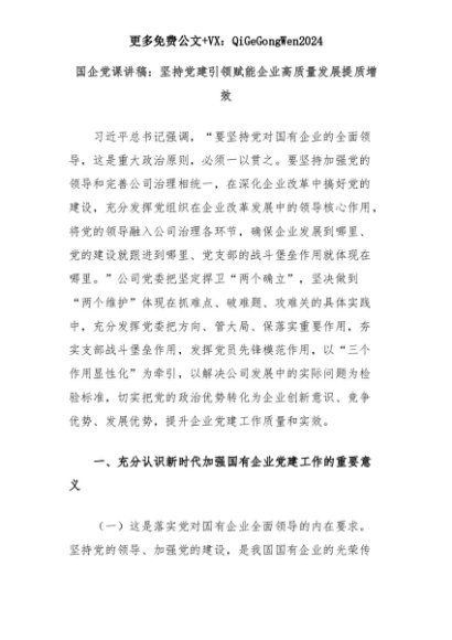 【七哥公文】2025年:国企党课讲稿:坚持党建引领赋能企业高质量发展提质增效+更多免费公文+VX:QiGeGongWen2024+更多免费公文+VX:QiGeGongWen2024