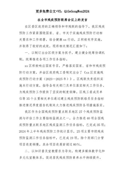 【七哥公文】2025年:在全市残疾预防联席会议上的发言+更多免费公文+VX:QiGeGongWen2024+更多免费公文+VX:QiGeGongWen2024