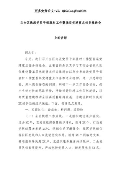 【七哥公文】2025年:在全区选派党员干部驻村工作暨基层党建重点任务推进会上的讲话+更多免费公文+VX:QiGeGongWen2024+更多免费公文+VX:QiGeGongWen2024