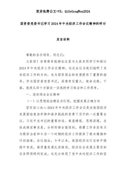 【七哥公文】2025年:国资委党委书记学习2024年中央经济工作会议精神的研讨发言材料+更多免费公文+VX:QiGeGongWen2024+更多免费公文+VX:QiGeGongWen2024