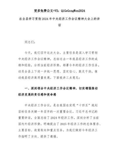 【七哥公文】2025年:在全县学习贯彻2024年中央经济工作会议精神大会上的讲话+更多免费公文+VX:QiGeGongWen2024+更多免费公文+VX:QiGeGongWen2024