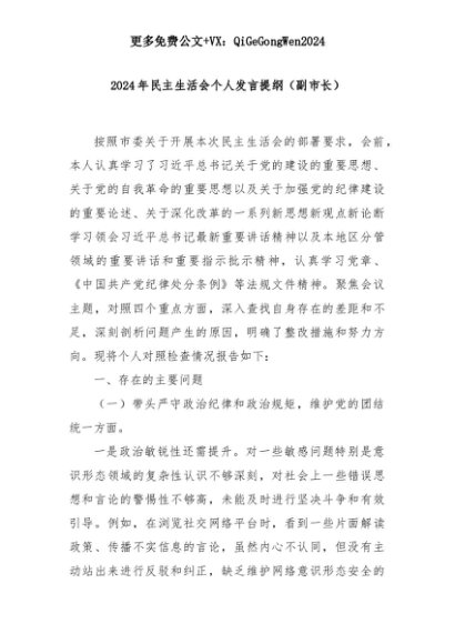 【七哥公文】2025年:2024年民主生活会个人发言提纲(副市长)+更多免费公文+VX:QiGeGongWen2024+更多免费公文+VX:QiGeGongWen2024