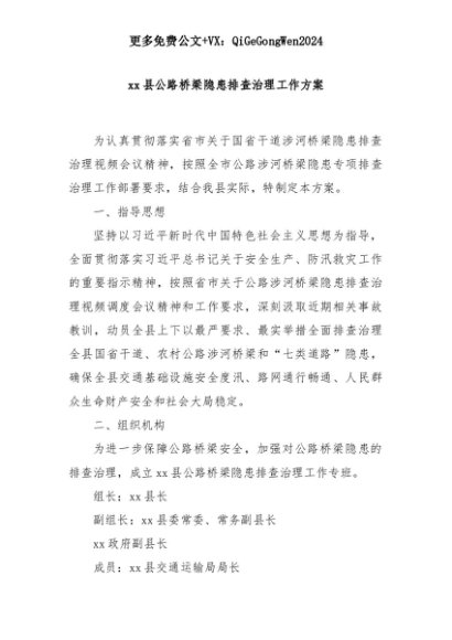 【七哥公文】2025年:xx县公路桥梁隐患排查治理工作方案+更多免费公文+VX:QiGeGongWen2024+更多免费公文+VX:QiGeGongWen2024