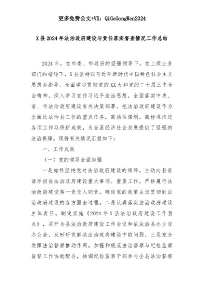 【七哥公文】2025年:X县2024年法治政府建设与责任落实督查情况工作总结+更多免费公文+VX:QiGeGongWen2024+更多免费公文+VX:QiGeGongWen2024