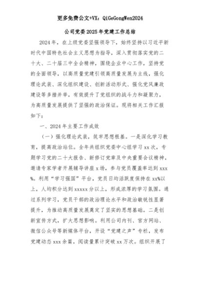 【七哥公文】2025年:公司党委2025年党建工作总结+更多免费公文+VX:QiGeGongWen2024+更多免费公文+VX:QiGeGongWen2024