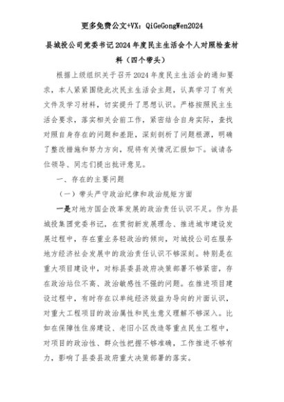 【七哥公文】2025年:县城投公司党委书记2024年度民主生活会个人对照检查材料(四个带头)+更多免费公文+VX:QiGeGongWen2024+更多免费公文+VX:QiGeGongWen2024