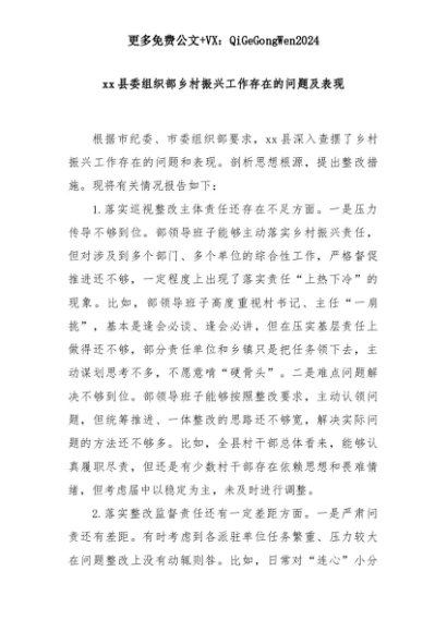 【七哥公文】2025年:xx县委组织部乡村振兴工作存在的问题及表现+更多免费公文+VX:QiGeGongWen2024+更多免费公文+VX:QiGeGongWen2024