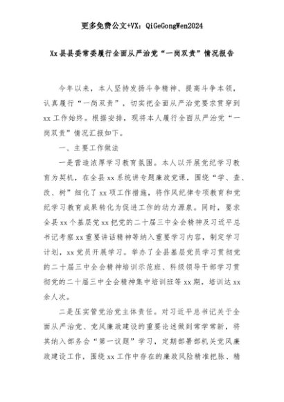 【七哥公文】2025年:Xx县县委常委履行全面从严治党“一岗双责”情况报告+更多免费公文+VX:QiGeGongWen2024+更多免费公文+VX:QiGeGongWen2024