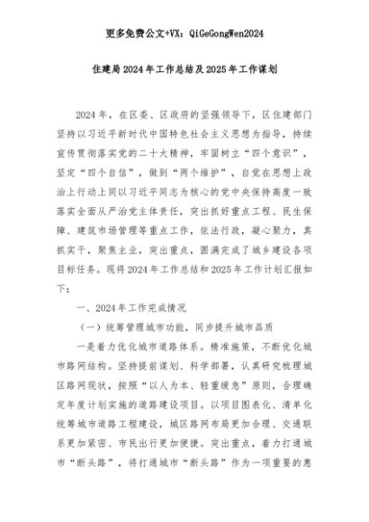【七哥公文】2025年:住建局2024年工作总结及2025年工作谋划+更多免费公文+VX:QiGeGongWen2024+更多免费公文+VX:QiGeGongWen2024
