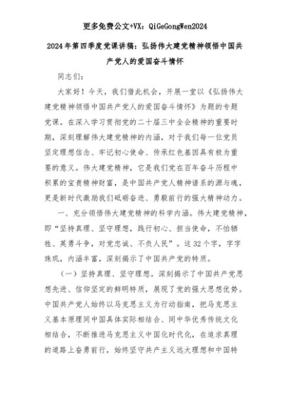 【七哥公文】2025年:2024年第四季度党课讲稿:弘扬伟大建党精神领悟中国共产党人的爱国奋斗情怀+更多免费公文+VX:QiGeGongWen2024+更多免费公文+VX:QiGeGongWen2024