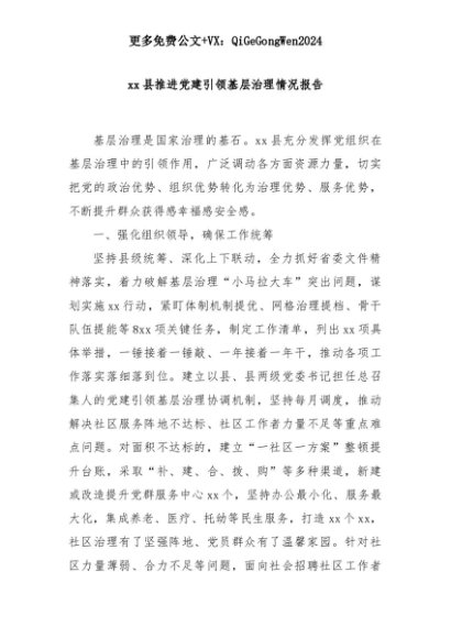 【七哥公文】2025年:xx县推进党建引领基层治理情况报告+更多免费公文+VX:QiGeGongWen2024+更多免费公文+VX:QiGeGongWen2024