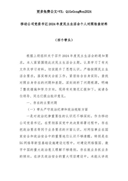 【七哥公文】2025年:移动公司党委书记2024年度民主生活会个人对照检查材料(四个带头)+更多免费公文+VX:QiGeGongWen2024+更多免费公文+VX:QiGeGongWen2024