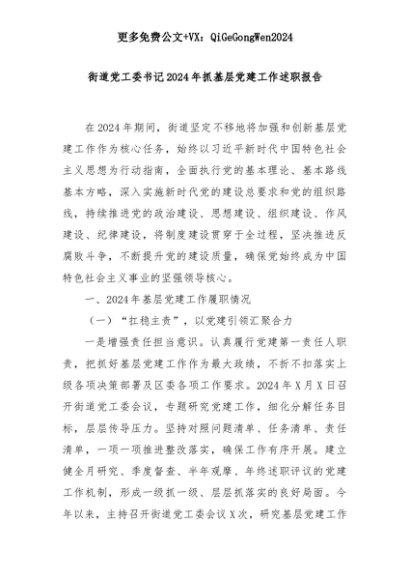 【七哥公文】2025年:街道党工委书记2024年抓基层党建工作述职报告+更多免费公文+VX:QiGeGongWen2024+更多免费公文+VX:QiGeGongWen2024