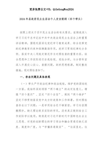 【七哥公文】2025年:2024年县政府民主生活会个人发言提纲(四个带头)+更多免费公文+VX:QiGeGongWen2024+更多免费公文+VX:QiGeGongWen2024