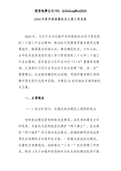 【七哥公文】2025年:2024年度市委直属机关工委工作总结+更多免费公文+VX:QiGeGongWen2024+更多免费公文+VX:QiGeGongWen2024