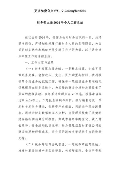 【七哥公文】2025年:财务部主任2024年个人工作总结+更多免费公文+VX:QiGeGongWen2024+更多免费公文+VX:QiGeGongWen2024
