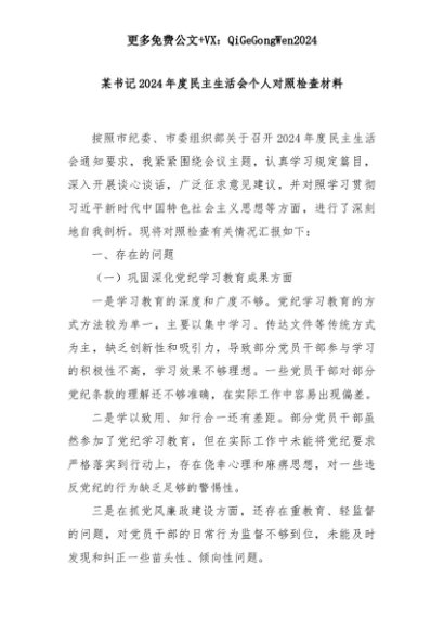 【七哥公文】2025年:某书记2024年度民主生活会个人对照检查材料+更多免费公文+VX:QiGeGongWen2024+更多免费公文+VX:QiGeGongWen2024