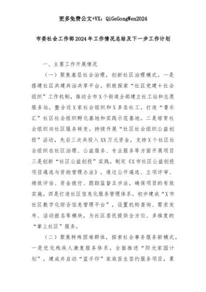 【七哥公文】2025年:市委社会工作部2024年工作情况总结及下一步工作计划+更多免费公文+VX:QiGeGongWen2024+更多免费公文+VX:QiGeGongWen2024