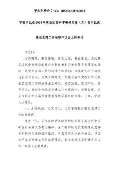 【七哥公文】2025年:市委书记在2024年度县区委和市委相关党(工)委书记抓基层党建工作述职评议会上的讲话+更多免费公文+VX:QiGeGongWen2024+更多免费公文+VX:QiGeGongWen2024