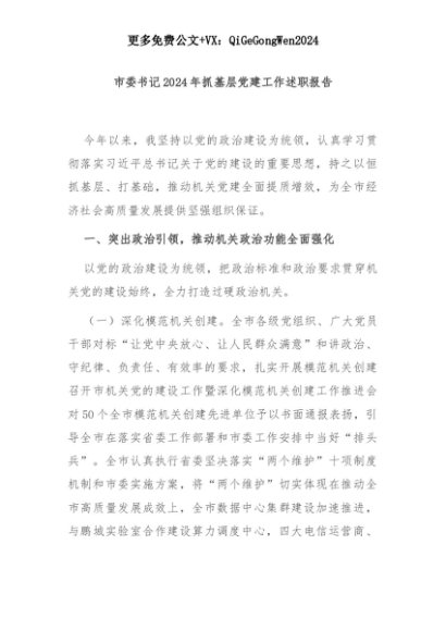 【七哥公文】2025年:市委书记2024年抓基层党建工作述职报告+更多免费公文+VX:QiGeGongWen2024+更多免费公文+VX:QiGeGongWen2024